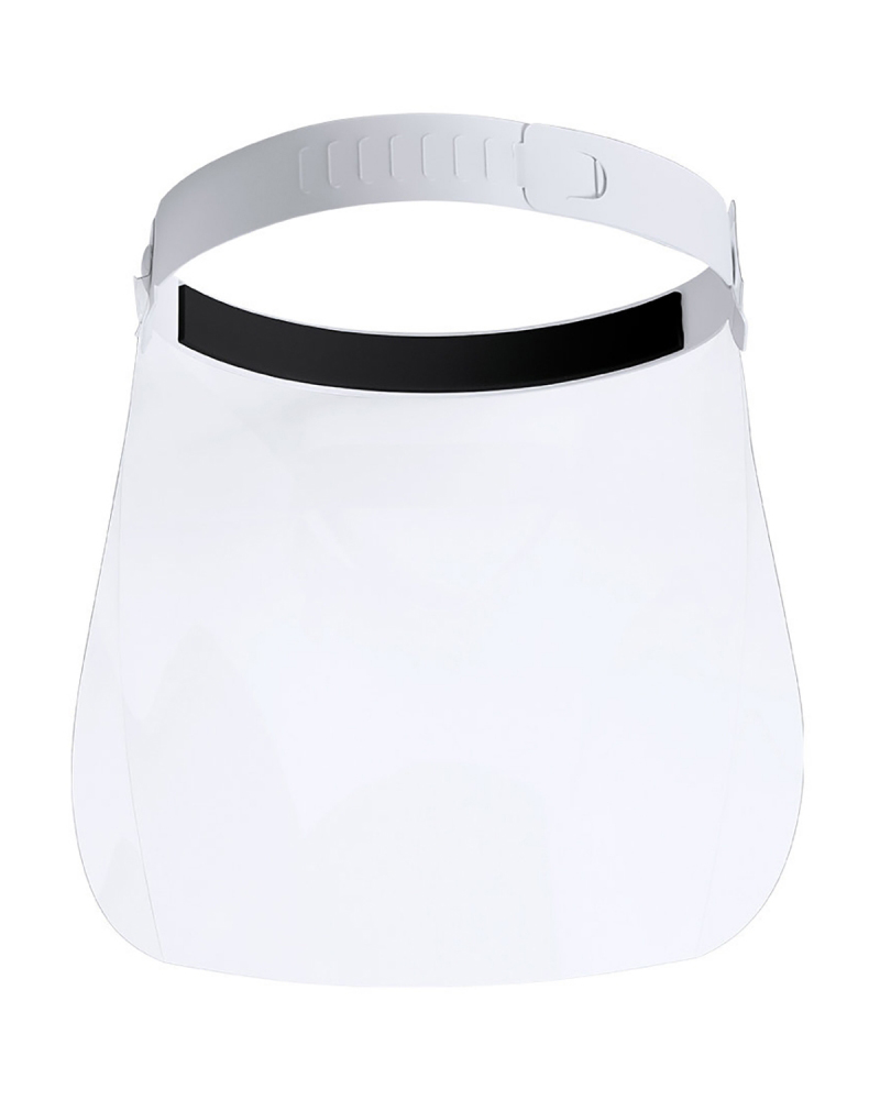 Visiera protettiva con fascia in PP regolabile con imbottitura protettiva sulla fronte. Dotata di agganci laterali dove collegare le fasce elastiche della mascherina in uso.